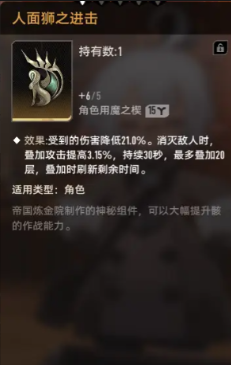 在搭配时可以直接选择人面狮之进击,这一个组件会拥有攻守兼备的优势,受到的伤害就可以降低21%。在高难度的副本中就可以让玩家硬扛很多的伤害,还有较高的容错几率。关键是在消灭敌人时叠加攻击还能有效提升3.15%,并且还会持续30秒的时间,最多就可以叠加20层。在叠加时还会刷新剩余的时间,这就意味着玩家只要一直打怪,那攻击就可以一直叠并且叠满20层,那攻击加成还真的是很夸张的。