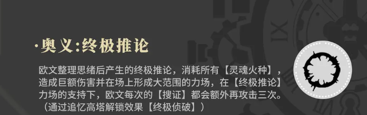在大招上面,欧文会使用到的就是终极推论的效果,他只使用这个技能会消耗掉所有的灵魂火种,因为目前游戏当中所有的角色使用大招的时候,都会消耗掉自己的灵魂火种,然后造成伤害之后,在场上欧文还会形成一个大范围的力场,只要是在力场其中的敌人都会再受到额外攻击,且是连续的3次,这里受到欧文的输出数值是会根据力场效果变化的,所以在力场放在一个合适的区域中时,整体带来的攻击效果还是比较强的。