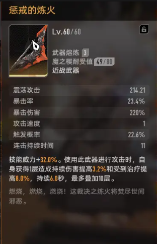 也有一些玩家认为可以选择使用惩戒的炼火过渡了。这一个武器只需要通过刷本获得材料就能够铸造,获取的难度真的并不是很高。如果是对比春玦戟。那这一个武器主要的优点就在于可以支撑面板。被动能力就可以获得20%~40%的威力加成,在一开始用来堆属性还是很不错的。不过还有一点需要注意,这武器的被动加成其实是有限制,一般只会对自己生效,并不会加到其他的武器上面。好在在第2次测试的过程中,近战武器本身就只是一般用来作用于过渡,那还是很不错的,可以直接拿到毕业武器,然后再重新的更换。