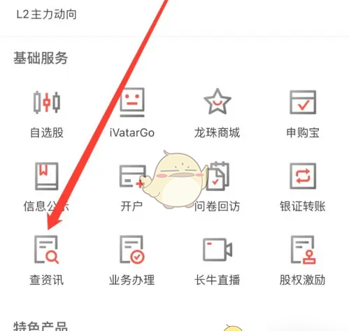 打开长江e号APP,点击首页底部“查资讯”按钮,即可进入资讯中心查看头条资讯、7*24小时直播、新闻公告、研报及长江特有的L2行情资讯(如黄金眼、热点分析)等分类内容,用户还可通过“更多”-“基础服务”中的“查资讯”路径快速访问。