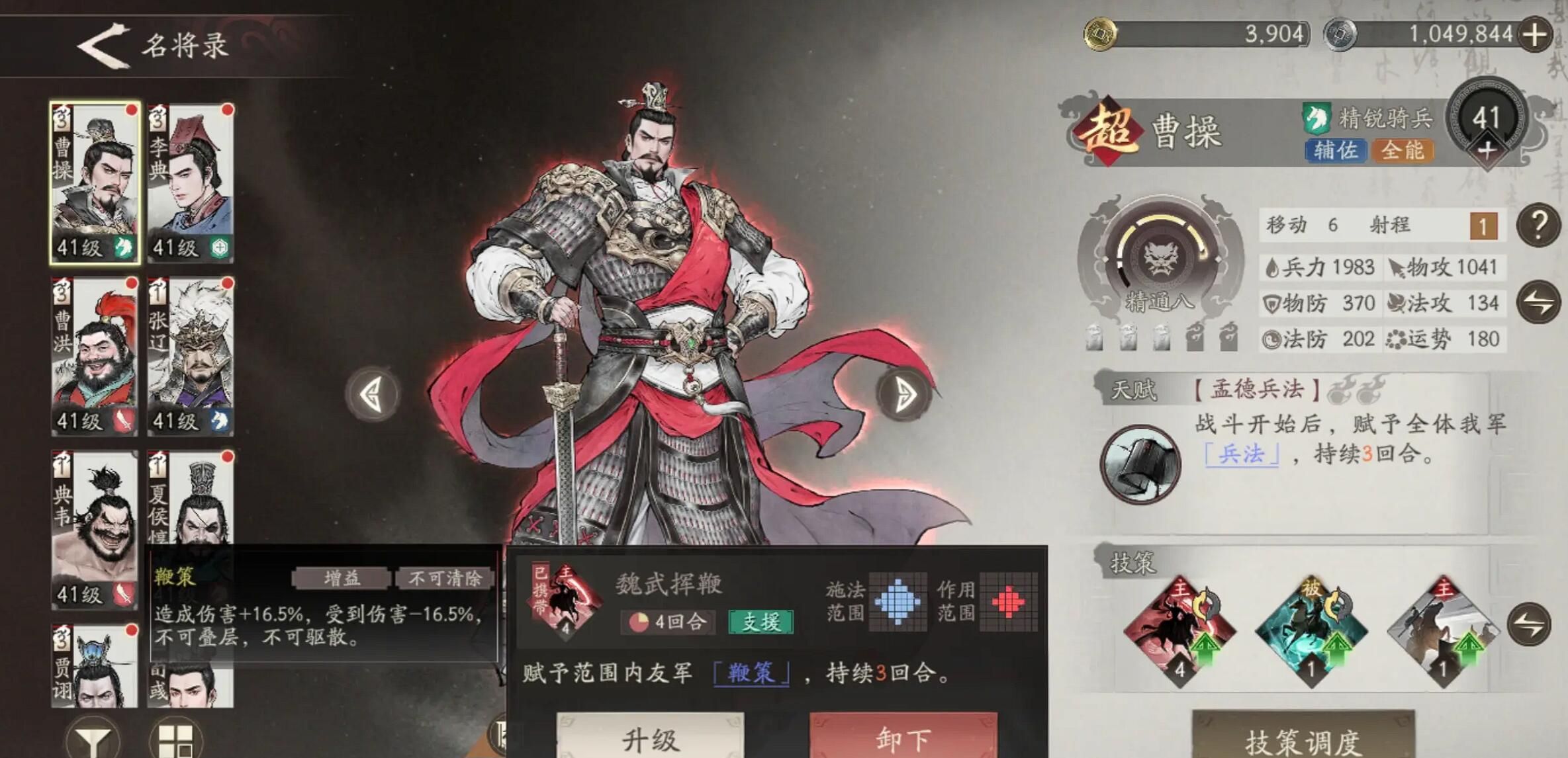 我们搞定阵容之后就要注意一下技能加点了,推荐大家先点群雄线的魏武挥鞭,他能造成范围伤害附加16%增伤和减伤,是开荒期核心buff,然后就点出天下归心(重骑兵线),唯一光环技能提升菱形2格内战法伤害10%。仕途的话可以先把重骑兵线解锁到40级拿天下归心,再补群雄线魏武挥鞭,最后点雄志(超世之杰)弥补天赋兵法持续时间不足,这个技能加全队10%攻防,能和天赋叠加用。