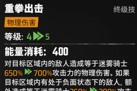 再然后在大招上面的效果是叫做重拳出击,这样发出一条竖着的光线,伤害也非常高,163是多段的输出,暴击概率也很大,可以对目标区域内的敌人造成迷雾骑士750%左右攻击数值的物理伤害,如果此时锁定的这个目标区域里面,正好有一些是处于负面状态下的敌人,那么还会额外造成等于迷雾骑士320%左右攻击力的物理伤害。