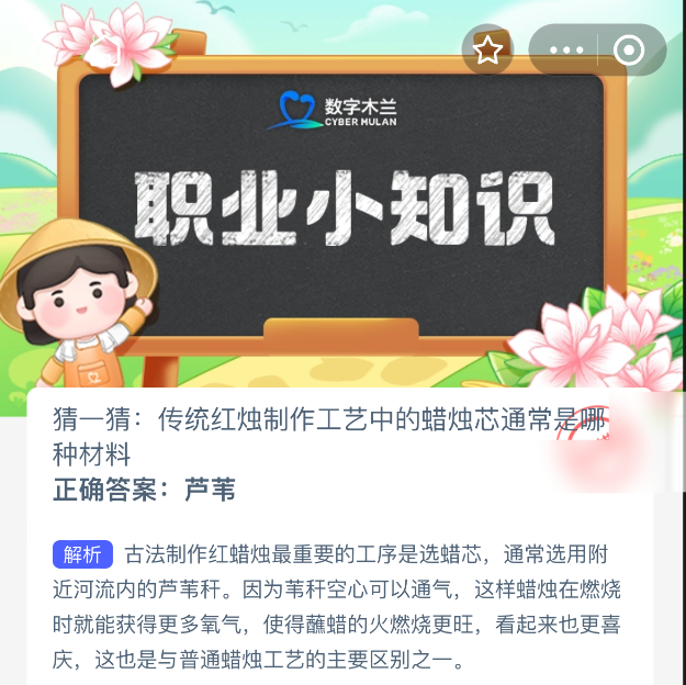猜一猜:传统红烛制作工艺中的蜡烛芯通常是哪种材料?【蚂蚁新村每日一题】2025年10月11日题目已发布!坚持答题,积累木兰币,即可加速小镇建设。答对本题,立即可享“产速+3/时”的加速奖励!今天正确答案是【芦苇】。古法制作红蜡烛最重要的工序是选蜡芯,通常选用附近河流内的芦苇秆。