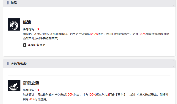 破浪这就是三回合冷却技能,属于一个群体攻击技能。召唤海浪就可以打出330%的伤害,关键是只要暴击,就能百分百把目标身上的减益效果全部延长一个回合。配合队友叠加伤害就可以形成持续的压制。奋勇之潮是一个终结技能,同样是三个回合,冷却又被称之为爆发王牌。全体会造成390%的高额伤害,而且还会有100%的几率可以直接挂易伤,让队友在后续的环节中会拥有更出色的输出。更厉害的是每一次暴击一个单位,自己就可以迅速的提升20%的行动速度。暴击如果满员的话,那就可以直接进入到半轮,简直就是越战越勇。