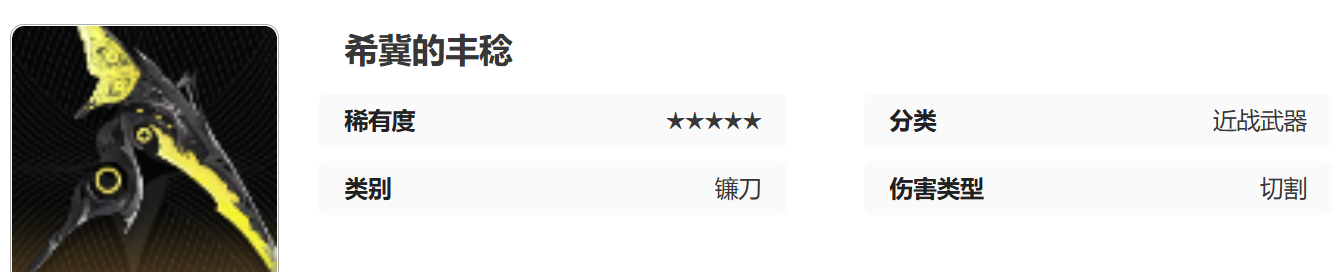 当前版本中的镰刀武器只有两把,分别是希冀的丰焾和赤腥镰刀,希冀的丰焾是一把五星品质的近战类型武器,武器的伤害方式为切割。