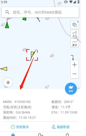 3、点击黄色或绿色三角形就可以查看船舶的基本信息
