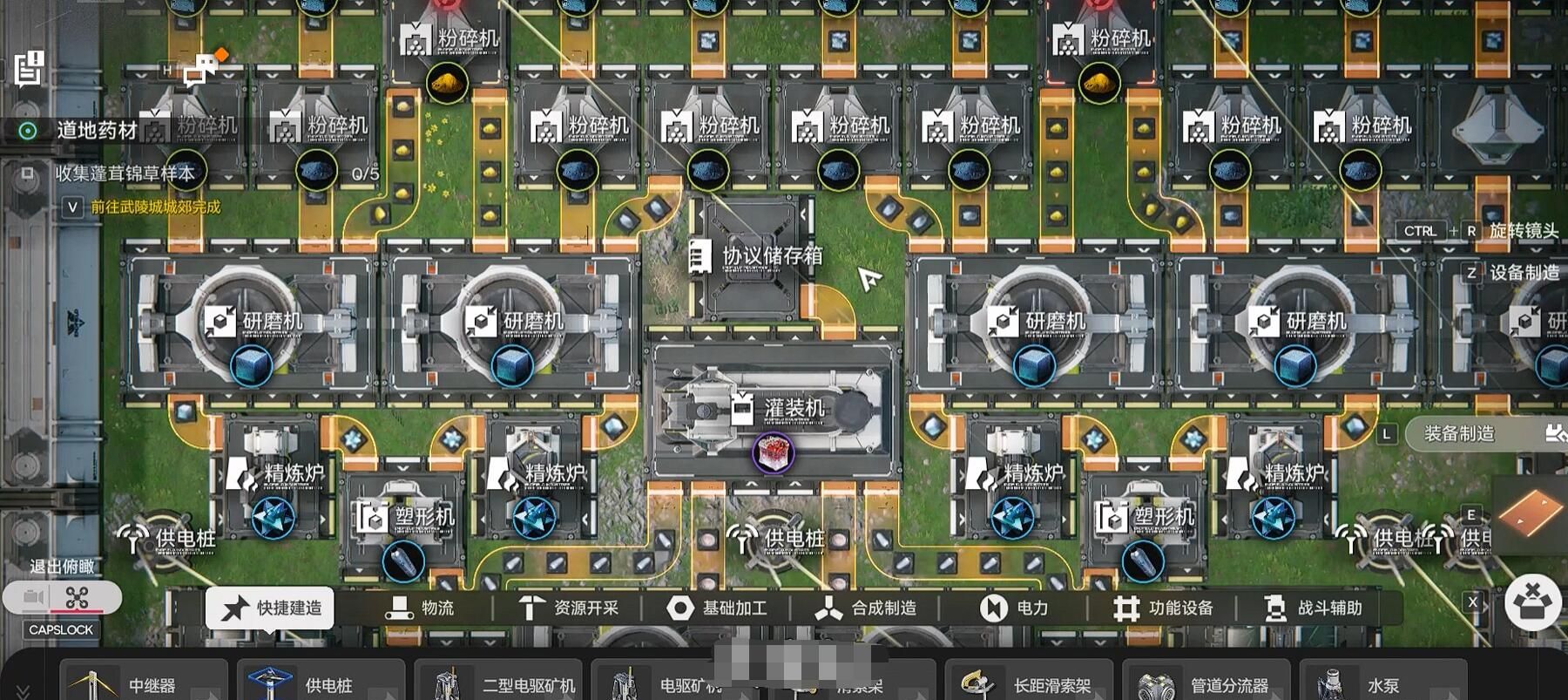 其实工厂由协议核心、生产线模块及电力系统这三大部分来组成的,其中的协议核心是中枢设施,黄色范围为供电区域,这个区域内能够建造精炼炉、粉碎机等设备。我们在最开始的时候解锁蓝图后,优先建造两条基础产线。首先就是推荐大家紫金矿→精炼炉→塑型机→灌装机(生产零件),种植机→粉碎机→罐装机(生产药品)。传送带的话其实是非常复杂的,这里就只介绍一下入门玩法就不太细说。但是基础上还是树形分布,有干线有分支,干线走原材料,越到后面的工序就越支线。主线带宽大于支线这样会避免材料堵路,精炼炉输出端连接3条传送带时,每条效率降至33%,建议重要物资单独走线。