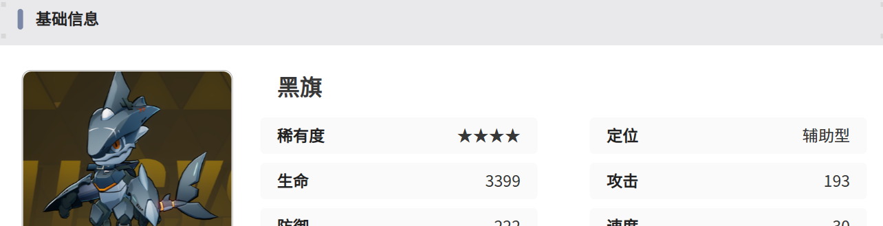 黑旗作为全面型的辅助,他的基础性能就比较好,比如生命值、防御能力以及速度都是可观的,其中速度达到30,能够在战斗中快速的行动,也能够抢占先机。另外黑旗也具备追击跟增益技能,每当本体执行完行动以后,他就开始现身,对主要目标发起攻击。在攻击时伤害可以达到140%,所以很多敌人防不胜防。