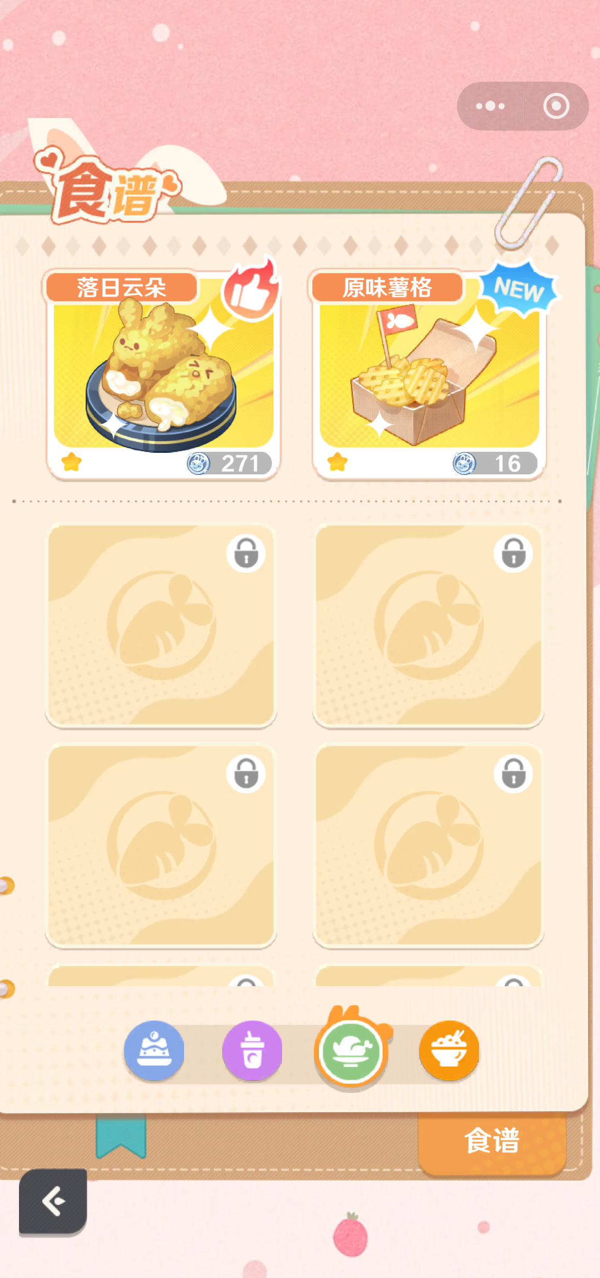 落日云朵这个美食既美味,而且在欣赏价值上也是很高的,推出新菜谱时需要拥有一个炸锅,另加一个奶品精制机,如果店铺中已经有这些厨具的话,可以根据它的等级要求进行升级。进入到食谱研发的界面之后,会通过转盘的方式选择制作美食所需要的原材料,需要玩家按照顺序将这些原料放入才能够成功的研制,如果顺序选错或者是指针没有指到正确的材料区域,则需要重新转动指针。