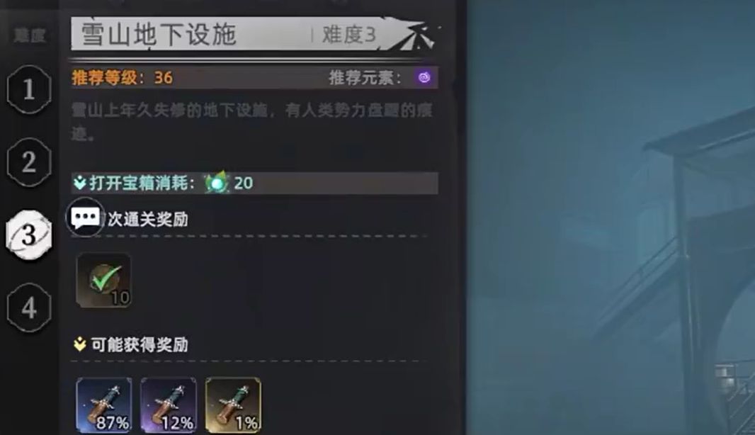 能获取冰晶剑的副本为雪山地下设施,在难度3时就有1%概率掉落金色品质的冰晶剑,而且掉紫色冰晶剑的概率很高,再加上难度4时金色冰晶剑的掉落概率只增加了0.5%,所以更建议想获取冰晶剑的玩家在前期只考虑刷难度3,等练度升上来或自己有更好的装备后,再去挑战难度4。此外,难度3的推荐等级虽然为36级,但技术好时20多级就可前去挑战,也令它成为刷冰晶剑效率最高的副本。此外,由于副本的位置在冰原,会受到寒冷影响,所以在下本前最好先给角色吃两个抗寒药。
