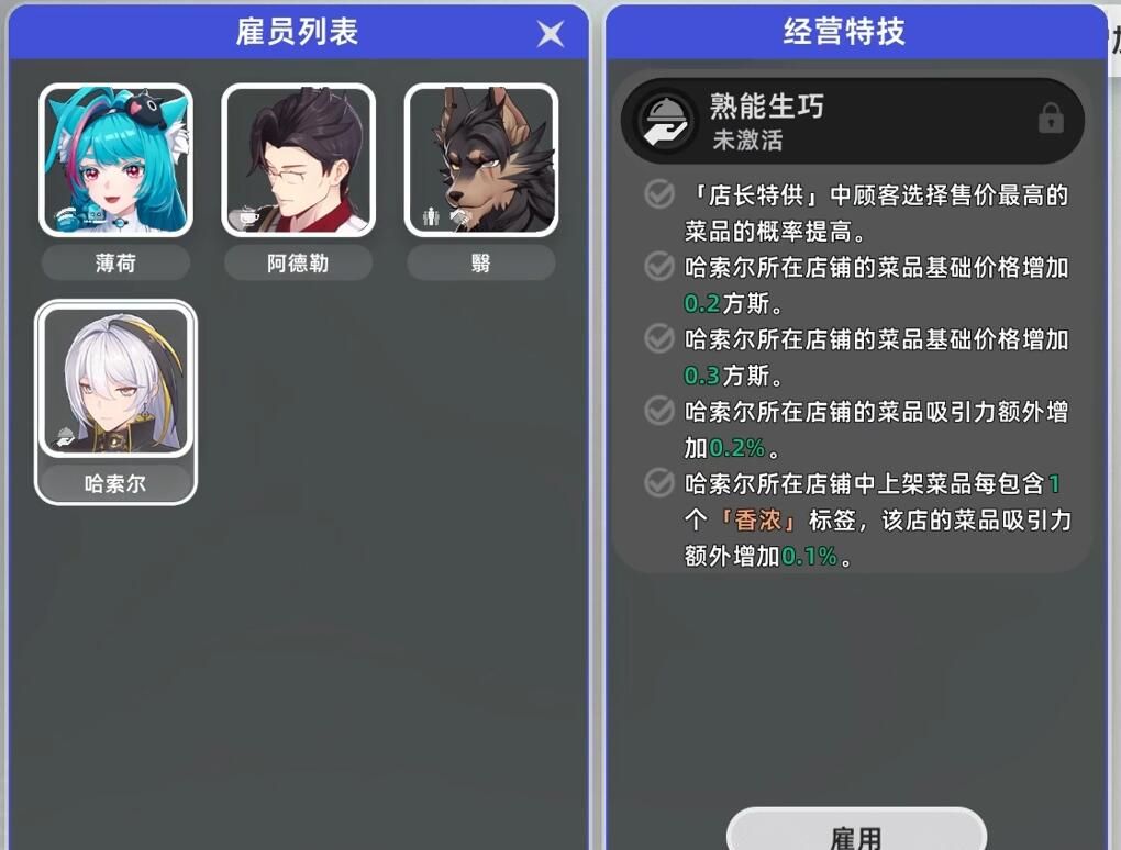 开店初期我们最先要做的就是功能解锁。进入店铺管理界面,点击右侧技能树图标,小编推荐大家先去激活哈索尔的熟能生巧,这个技能让你累计制作咖啡、菜品解锁的被动buff,能让员工制作的售价提升售价。招财猫功能暂时可以先不激活,需店铺3级且10次五星好评,前期不用浪费资源。初始店员哈索尔自带咖啡亲和特性,大家可以优先分配经验升到2级,解锁基础拉花技能。