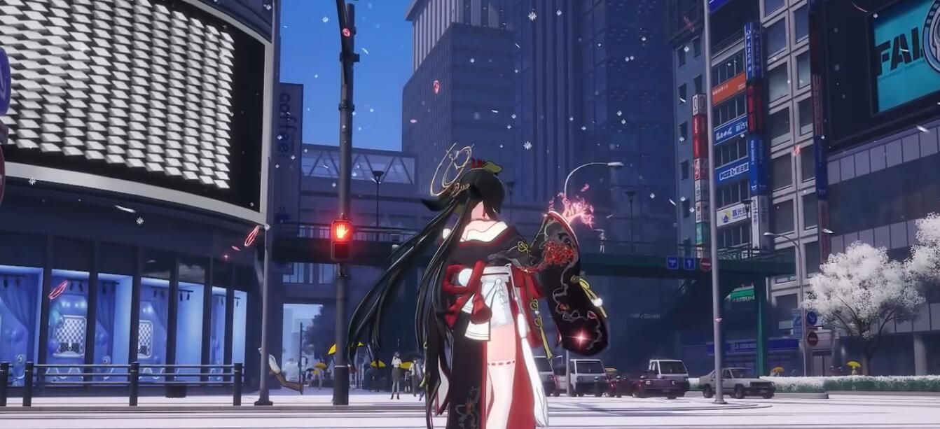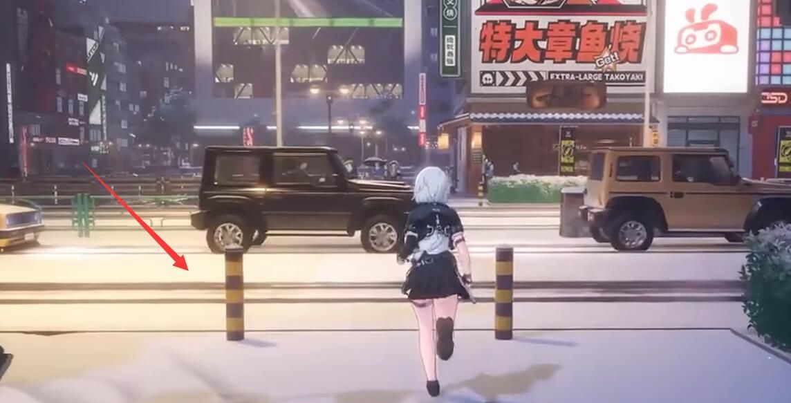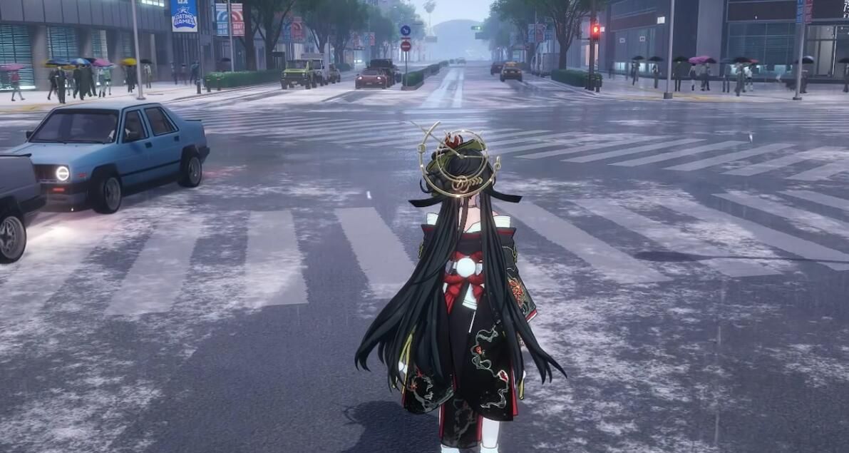 说完天气系统,还要说一下配合天气的时停机制,普通游戏时停就是画面静止,但异环里的雪花不一样,会瞬间变成那种亮晶晶的静态颗粒,而且全都朝着你的方向,有种黑客帝国那种子弹时间的立体电影质感,而且室内外积雪的区分也很有意思。进商店前脚下还是白茫茫一片,推开门的瞬间雪就没了,出来又立刻开始积雪。但是目前还是有小bug,屋檐底下经常薛定谔的雪,明明站在室外,雪花却突然停了,走两步又开始下。不过整体不影响体验。