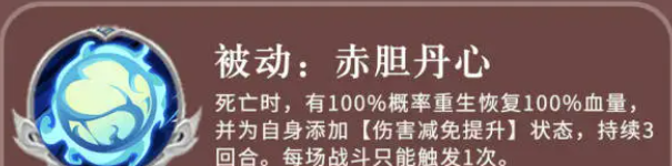 所以在需要攻击的时候周泰是可以针对敌方输出进行主要攻击的,他在技能上面有一个必杀技,叫做飞浪涛风,使用这个技能的时候,是针对敌方的一个目标进行攻击,这里的攻击百分比达到了180%,然后加上975点的固定伤害,此时还会有百分之百的伤害可以进行转化,转化的能力就是一个重伤的状态施加给敌人,在敌人身上重伤的状态会影响后面三个回合的掉血效果,那么他在被动能力上面还有一个赤胆丹心,这个技能就是周泰在被敌方击杀并导致死亡的时候,有百分百的概率会重生。