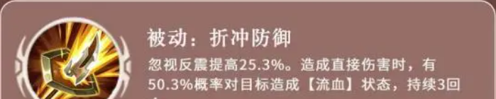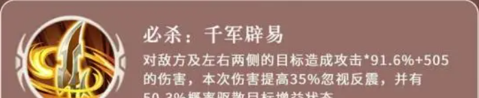 这个技能使用的时候,可以对敌方以及他左边和右边两个敌军的目标,一共3人造成攻击,攻击数值的话,基础的是有91%的数值,然后加上505的固定数值,那么这一次的伤害后期还可以提升35%的忽视效果,这里忽视的效果一般是针对于反震的,并且同时还有50%左右的概率,可以去驱散掉敌人身上的一些增益状态,不过驱散的数量不多,那么他在被动上面有一个折冲防御的效果,这个折冲防御也是针对于忽视反震的效果,触发的时候带来的效果是很不错的。