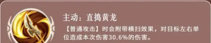这里忽视反震概率会有提升,提升的数值达到了25%左右,如果是造成一些直接伤害的话,也就是说魏延他在攻击敌人造成了直接伤害的时候,会有50%的概率可以对这个目标再一次施加流血的状态,流血状态在敌人身上体现出来的就是掉落10%的攻击力,那么在持续3个回合的流血状态生成时间之内,大家也可以用到魏延的其他技能进行攻击,他的主动技能叫做直捣黄龙,使用这个技能的时候会附带一定的横扫效果,这个横扫效果是使用普攻的时候可以额外带来的,此时会对一个敌人周边,也就是左右两个角色带来本次伤害的一个额外的附加伤害,这一次附加伤害百分比不高,只有30%,但是毕竟是普攻之外的追加伤害,所以也可以当做是一个连招后面的小招式使用。