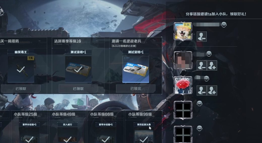 当然在特殊老友的招募活动当中,玩家也可以在招募面板内,邀请并未注册游戏的玩家,随后和他一同组队,当小队等级升级到二十五级、四十级、六十级、九十级时,分别能够领取到游戏内的资源奖励,最高级时,即可获取皮肤奖励。