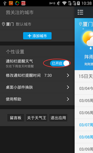 2、接着左侧会弹出功能列表,选中【通知栏提醒天气】将其开启(ps:这个提醒仅在下雨天时提醒哦)
