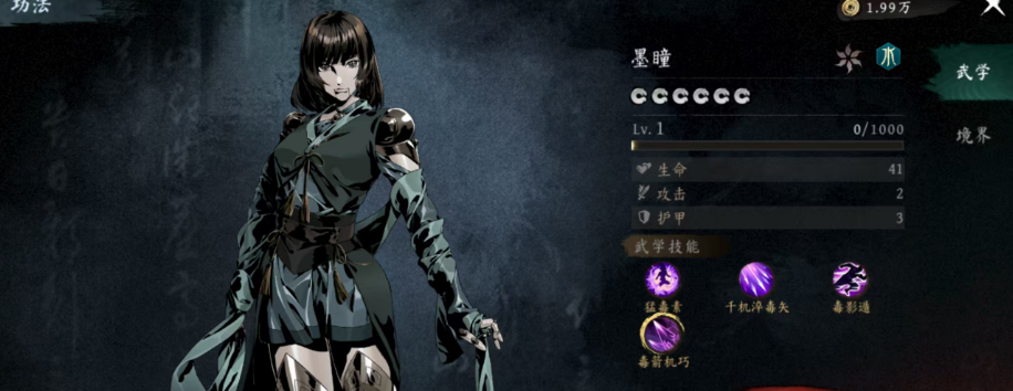 第三个为大家推荐的就是墨瞳,这个目前来说是一个比较适合玩毒流派的英雄,她在游戏当中带的毒素效果,爆发能力还是不错的,而且后期的增益效果上面,是可以将毒素爆发的能力带来50%的伤害提升效果,后期技能上面有一个千机淬毒石,这个技能带来输出的时候一次性就可以带来9枚毒箭的远程攻击,但是要消耗的内力数值比较高,消耗了30点内力数值之后,这里造成攻击的同时,还可以带来40%的水属性伤害,这个属性伤害当中同样也带有一定的中毒效果。所以给敌人带来的负面影响还是非常多的,但是她作为一个水属性的角色,后期的技能上面大部分都是一些水属性的范围伤害。