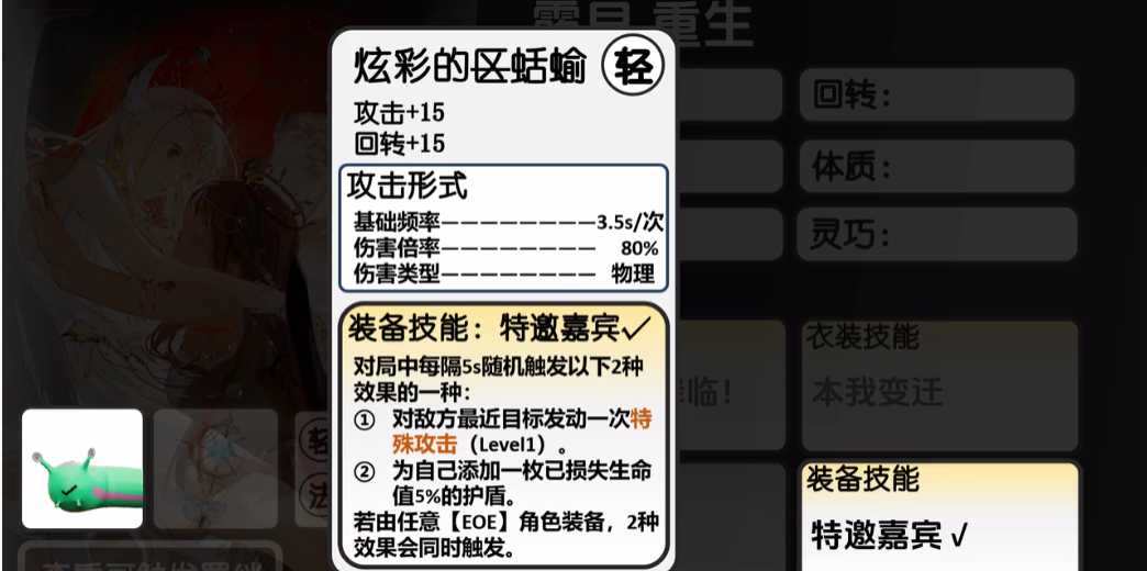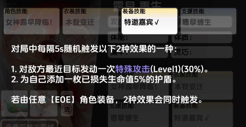 露早的装备技能可以选择特邀嘉宾,这个装备技能带来的效果是对局中每隔5秒都会随机触发以下2种效果的一种,第一个就是对敌方最近目标发动一次特殊攻击,第二个是为自己添加一枚已损失生命值5%的护盾,如果此时是由任意EOE角色进行装备的话,这2种效果会同时触发哦,最后露早还有一个支援技能叫做恩孽缠生,是在己方角色受到攻击时可以用到的支援效果,此时会扣除攻击者当前生命值2%的生命,并且同时回复受攻击者等量生命,每名角色每8秒时间只能只能触发一次。