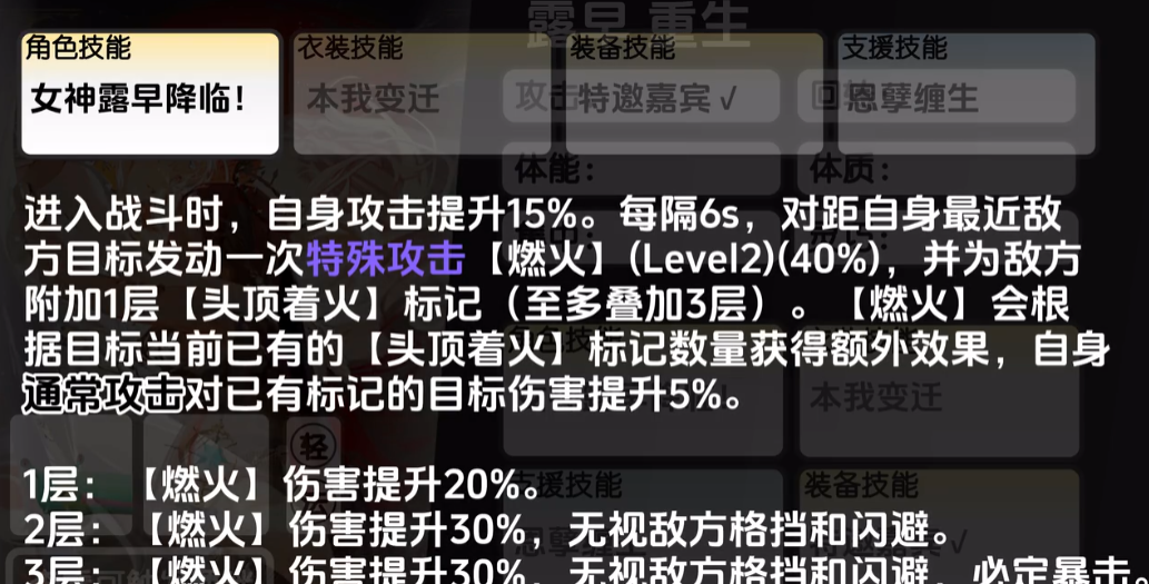 角色技能当中女神露早降临的效果最明显,一开始进入战斗时这个技能就可以用到,可以给露早带来自身攻击提升15%的效果,且同时每隔6秒的时间,都对距自身最近敌方目标发动一次特殊攻击【燃火】,并同时给敌方附加1层【头顶着火】的标记,这个标记的限制就是最多只能叠加到3层,这里带来的【燃火】效果就是会根据目标当前已有的【头顶着火】标记数量,来获得额外效果,同时自身通常攻的对已有标记的目标伤害提升5%,所以这个标记的层数越多输出就越强,【燃火】的效果是给大家的伤害提升20%的数值,一层是20%的提升,达到2层的话们就是30%的数值,且同时可以无视敌方格挡和闪避动作,最高的3层时还是30%的数值提升,但是除了在格挡和闪避的动作可以无视之外,还有一个必定暴击的加成。