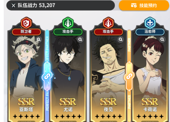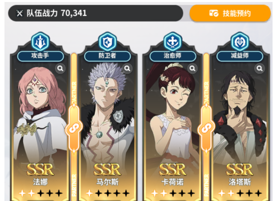 前期阵容不需要纠结,抽卡系统赠送的魔导士凑在一起就是超强的开荒队。具体的搭配自然就是亚斯塔、尤诺、诺艾尔和夏洛特。在队伍中亚斯塔是肉盾担当,自带一个大范围的挑衅技能,可以把敌人的火力全部都引到自己的身上,可以保护队友安心输出。尤诺不仅是一个攻击手,同样也是一个减益师,在输出稳定的同时还可以给敌人挂各种负面效果,可以削弱敌方的战斗力。诺艾尔主打的是防御辅助,可以给队友增加防御buff,让整个队伍的生存能力能大幅度的提升。