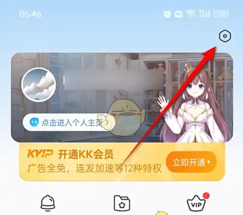 1、打开KK键盘“我的”页面,点击右上角的小齿轮图标进入。