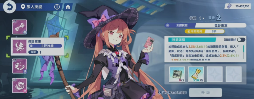 而另外的一个主控技能叫做诡影重重,虽然是主动技能,但是带来的主要效果是控制造成了暗性伤害之后,她会进入一个显影的状态里面,这个状态相对来说就是非常适合召唤队使用的一个状态,因为进入这个状态之后,她每3秒之内就会召唤出一个召唤物,这里的召唤物叫做南瓜影灵,在后续的15秒时间之内,召唤出来的南瓜影灵会进行一个自动攻击的效果,对敌人造成输出的话,带来的属性伤害是暗系仆从的伤害类别,一般在战场上面,她召唤来的召唤物虽然持续时间非常长,但是在数目上面会有数值上限,场内最多的情况下只能存在4个南瓜影灵,而在雾语自身的技能效果以及南瓜影灵的技能效果上面都会跟暗系的印记有关。