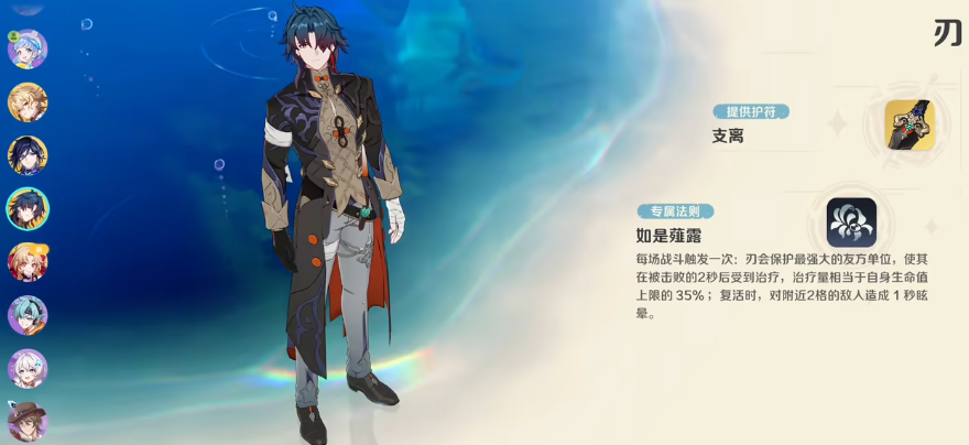 刃它的专属法则就是可以保护目前攻击力最强的一个队友,让这个角色被击败的之后,两秒时间之内就可以快速得到一定的治疗,而且在他带来复活的情况下,还可以对附近两个位置上面的敌人都带来1秒的眩晕控制,这个技能给他搭配的情况下,就提高了整体团队的胜率,在团队针对助力核心被秒杀的情况下,用他的这个技能就可以直接进行复活来继续战斗,那么这里对敌方带来的压制效果就非常强,而他的另外一个装备,用到的就是护符效果,跟这个角色放在一起的话带来的能力很高,这个护符叫做支离,主要是可以给他带来足够的防护能力的。