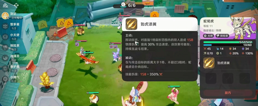 目前蛇尾虎的技能效果叫做如虎添翼,这个技能是有两个效果的,上面的助动效果造成的能力是会用一个挥动双爪的招式对敌人进行输出,这个技能相对来说输出的范围不大,只能对他前面一格的敌人来进行输出,而且造成的物理伤害其实相对于与其他大范围的输出来说,这里造成的只有扇形范围的输出,所以造成的物理伤害数值只有158点,这个范围相对来说限制性比较大,毕竟是一个扇形范围,如果没有敌人站位比较巧的话,那么这个技能生效的可能性也需要大家注重它的走位。