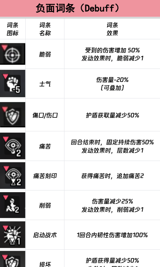 接着,来说说负面词条。脆弱是一个能让你付出代价的负面效果,它会让你承受更多的伤害——高达50%。不过,这个词条并非完全无解,每次脆弱状态发动时,它会减少1层,所以你在某些回合内可以通过消耗掉脆弱层数来减轻自己承受的压力。如果能合理掌握脆弱的持续时间,避免过多叠加,可以有效控制其带来的负面影响。