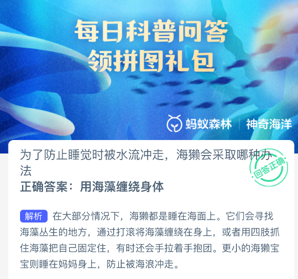 为了防止睡觉时被水流冲走海獭会采取哪种办法?【神奇海洋】10月29日新题目已开答!正确答案现已公布,点击领取拼图,一起为修复海洋生态贡献力量!今日正确答案是:【用海藻缠绕身体】。在大部分情况下,海獭都是睡在海面上。它们会寻找海藻丛生的地方,通过打滚将海藻缠绕在身上,或者用四肢抓住海藻把自己固定住.