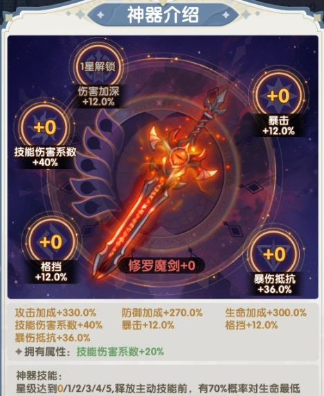 先来看看修罗魔剑的属性面板,修罗魔剑面板熟悉非常全面,攻击加成高达+330%,技能伤害系数+40%,并且额外提供暴击+12%、格挡+12%与暴伤抵抗+36%,让输出与生存兼备。相比其他偏单一的神器,修罗魔剑属于实打实的全能型输出神器。