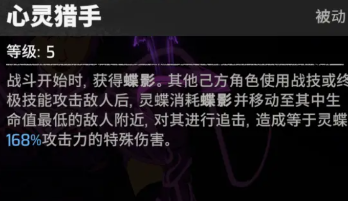 大家还可以使用理智1,进一步的追击伤害,还有一个终极技能伤害也是非常高的,但是需要后续大家来不断的进行触发,项终极技能是可以到目标区域当中来,对某个随机敌人造成六次的特殊伤害,并且还可以增加灵能印记的状态,只要受到普通攻击或者战斗技能伤害的玩家们,都可以引爆一层,还可以对目标敌人造成特殊的一个伤害,玩家们在使用战斗技能时,可以来消耗单体的伤害,获得追击的资源,但需要注意的是,位移是不能够选择落点的位置。