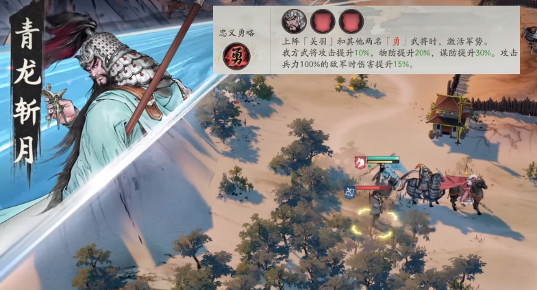 想要在匡复汉室中让自己获得更多的胜利,就需要多去选择一些强力的角色,桃园铁三角是比较推荐的,在挑战的过程中,玩家可以选择刘备为主,关羽和张飞作为辅助,这几个成员在游戏里都会有较高的战斗能力,张飞可以在游戏里利用破甲追击打出较高的伤害,关羽在对战的时候,也会有比较高的爆发输出,能在战斗的时候打出高额的伤害,就算利用技能之后,还能产生额外强大的伤害能力,刘备虽然输出能力并没有那么优秀,但是可以给队伍的其他成员回血,非常适合应对各类战役,尤其是一些持久对战。