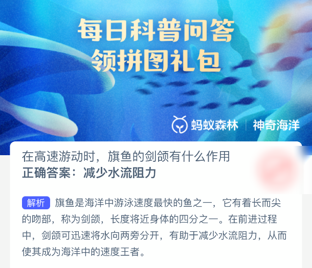 以上就是在高速游动时,旗鱼的剑颌有什么作用?神奇海洋今天答案最新2025年10月31日分享,更多相关攻略内容,请点击关注更新!