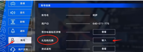 2、设置里找到账号,点击账号栏后在右侧就会有个礼包码兑换,点击输入