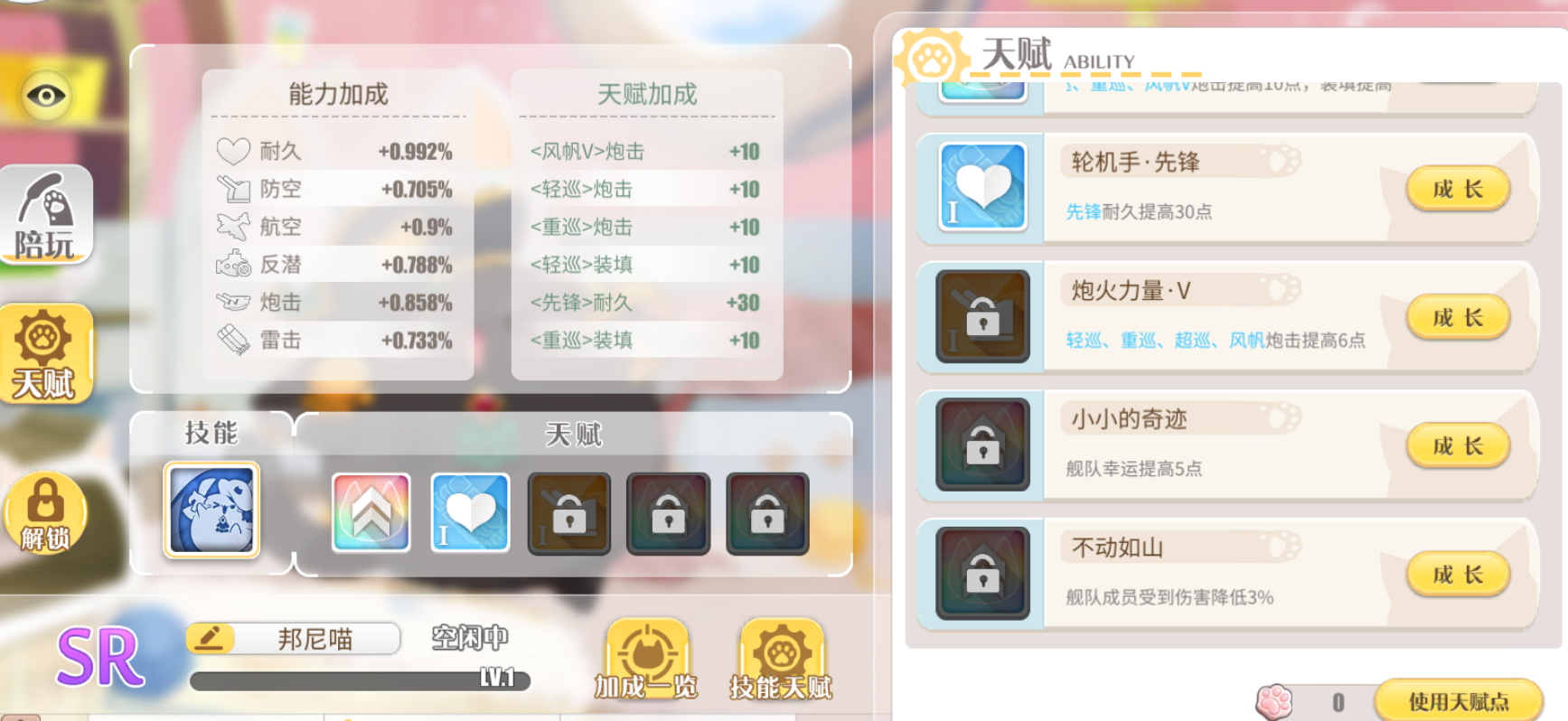 从属性配置来看,邦尼喵在后勤类数值上有不错的表现,尤其体现在耐久、炮击与航空方面的增益效果。其拥有的固定天赋包括:不动(全队减伤3%)、战旗重扬(提升轻巡、重巡及风帆舰种的炮击与装填各10点)、小小的奇迹(舰队幸运值+5)、炮火覆盖V(增强轻巡、重巡、超巡及风帆舰种的炮击能力),以及轮机长·先锋(先锋编队耐久增加60点)。