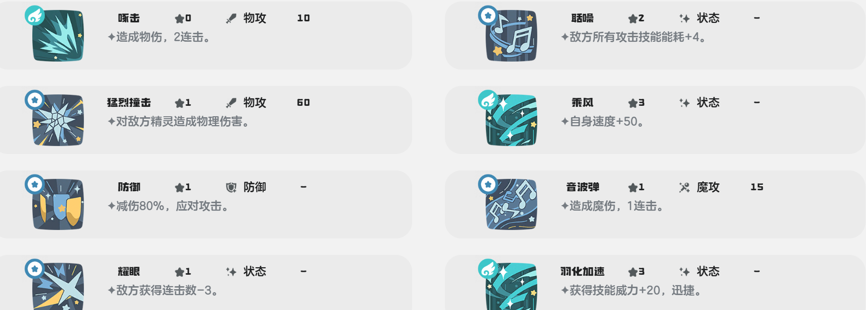 玩家在培养咔咔雀性格的时候,可以有效的提升速度,这样的话就直接培养开朗,还能够提高加速度,不减攻击和魔攻,此时可以培养它的天真性格。正是因为咔咔雀得相对独特性,玩家在选择给它搭配具体方案的时候,建议玩家直接精灵进行定位,比如想要搭配输出类型的团队,这时候就直接使用咔咔雀的飞翅连击,空气切割等等技能,如果玩家只是想要搭配生存类型的阵容的话,此时就需要使用折翼求生,乱冲,防御等等。