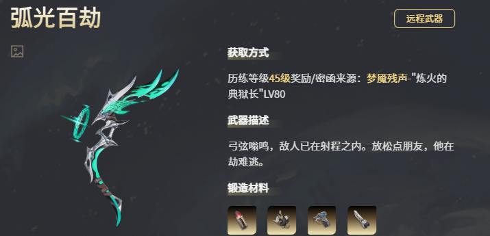 如果大家不知道怎么选择这里弓箭类型武器的话,大家可以直接选择弧光百劫这个武器,它在游戏当中达到了5星级别,而且在弓箭类型输出上面是非常实用的,外观设定也是非常高的,其中的弓箭带来的射速能力也是非常高的,而且可以在光环的指引下来增加大家瞄准的精准度,所以在操作上面相对来说上手的难度没有那么高,特别是新手第一次接触弓箭类型的武器的话,这把武器它有瞄准加成机制的话,也可以带来更多的输出达成率。