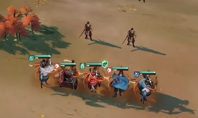 接下来就是队伍中的站位问题了。由于夏侯惇是一个比较坦克的角色,因此小编建议让他先顶在前面。场上会先出现两个小兵,此时可以让曹操站到这两个小兵之间,先把他们给清掉,这样的话队伍能够获得整体的攻击力加成。除此之外,每个角色之间的距离不能够太远,这样比较容易触发合击效果。