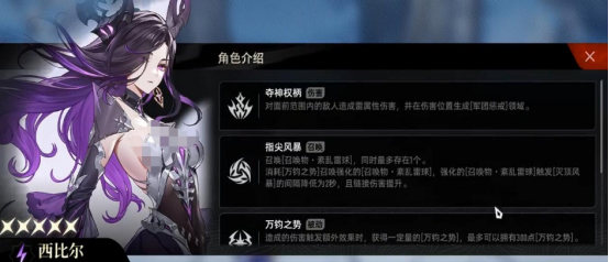 首先比较推荐的五星角色就是西比尔,属于雷属性角色,在整个队伍当中可担任主c位置,具有着较为出色的召唤能力,后在召唤的同时还有着出色的输出效果。有较为出色又别致的技能,比如夺神权柄,在搭配具有特色的指尖风暴以及大招,能够轻松扰乱敌人的战斗节奏,最终造成具有高伤害范围的雷电攻击。是此角色无论是在打击小怪还是在打击精英的时候,都表现得非常出色,全面提升具体的扩容率。此角色养成方法相对来说比较简单,成型比较早,对于资源依赖极低,即便没有复杂的配对,依旧能够享受极强的能力,是新手开荒的优质之选。