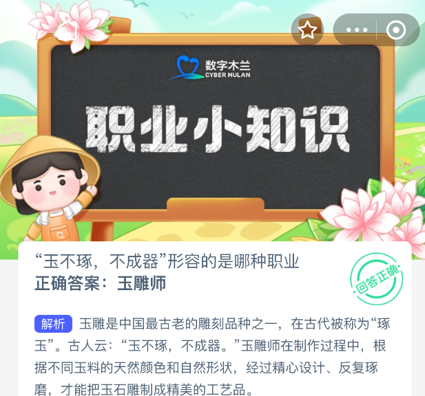 以上就是“玉不琢,不成器”形容的是哪种职业?支付宝蚂蚁新村最新答案2025年11月5日,更多精彩内容,请点击关注更新!