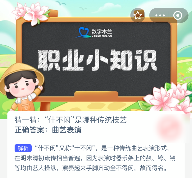 猜一猜:“什不闲”是哪种传统技艺?【蚂蚁新村每日一题】2025年11月6日题目已发布!坚持答题,积累木兰币,即可加速小镇建设。答对本题,立即可享“产速+3/时”的加速奖励!今天正确答案是【曲艺表演】。“什不闲”又称“十不闲”,是一种传统曲艺表演形式,在明末清初流传相当普遍。