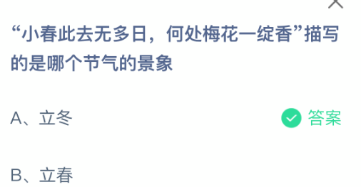 以上就是“小春此去无多日,何处梅花一绽香“描写的是哪个节气的景象,支付宝蚂蚁庄园2025年11月7日答案最新,更多精彩内容,请点击关注更新!