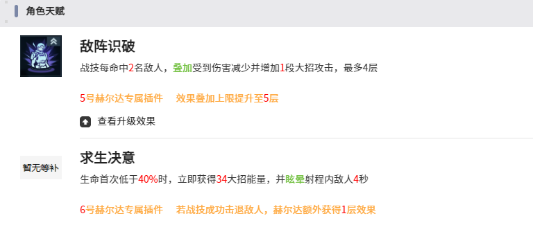 赫尔达强度完全是跟着覆盖人数走场上的敌人越多,那么就会更加的强势。不仅可以叠多层减伤,并且还是一个硬坦型的输出。大招的段数还有释放的频率都会明显的提升,相当于是一个又肉又能打的角色。而且自带一个入场爆发以及快速大招的特性,在入场之后随手扔出一个手雷就可以直接爆炸一片。大招转的比较快,而且适配性是比较强的。两个适配模组更有侧重,在选对模组之后就可以精准的发力,第1个是就地联合,第2个就是一致战线。