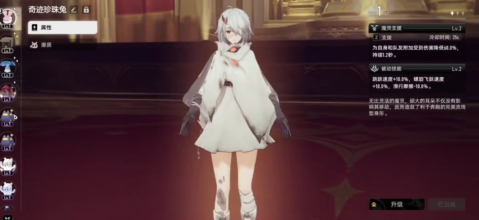 整体而言,珍珠兔魔灵是一个偏生存能力的魔灵,它并不具备有很强的攻击数值加成,实际在PVP战斗当中,它的出场率非常低,只有当玩家前期跑图时,它才能够发挥出效用。只建议前期玩家过渡使用,若后期有输出能力更强的魔灵单位,也可以直接替换掉珍珠兔魔灵,培养其他的魔灵单位。