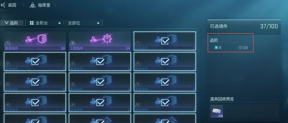 另外就是插件的获取方式,大家可以通过黑盾征募和限时征募的方式来获得。在征募时我们要先获得队员的本体,这样才能获得这个队员的专属插件。其次就是插件的回收,如果大家手上有多余的插件可以进行回收,回收按钮就在队员的插件装备页面,点击右侧的品阶就可以实现批量回收,r级的插件回收之后可以获得信赖之证,sr级插件回收之后则可以获得信赖之光和信赖之证。