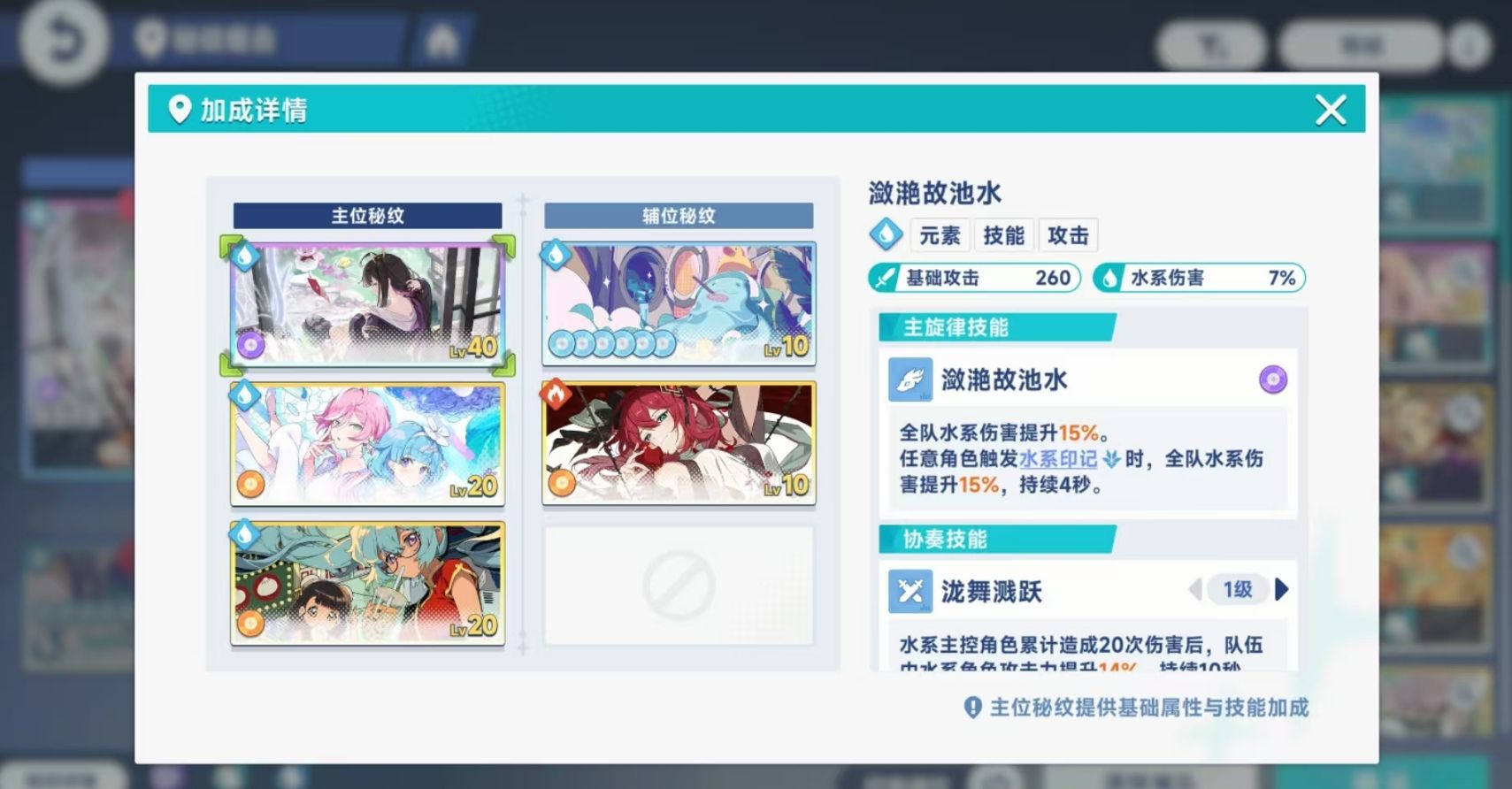 其次,由于秘纹存在着品阶的差别,且不同品阶的秘纹在加成效果上有着较大的差距,所以各位在同元素秘纹数量足够时,优先选品质较高的秘纹来作为主位秘纹。比方说,各位有一张虹彩土系秘纹和三张土系四星秘纹时,可直接用一虹彩加二四星的主位秘纹搭配方案,另一张是四星秘纹则放在辅位秘纹栏里。若玩家所拥有的秘纹都为同一品质,则根据队伍的特点来挑选合适的进行搭配,例如队伍走普攻流则选对普攻加成大的,走技能爆发流则选能提升技能伤害或加高爆发的。