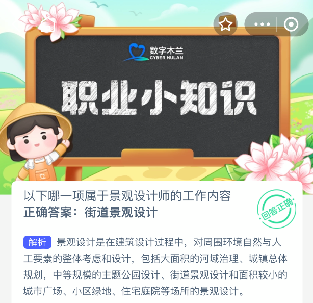 以下哪一项属于景观设计师的工作内容?【蚂蚁新村每日一题】2025年11月7日题目已发布!坚持答题,积累木兰币,即可加速小镇建设。答对本题,立即可享“产速+3/时”的加速奖励!今天正确答案是【街道景观设计】。
