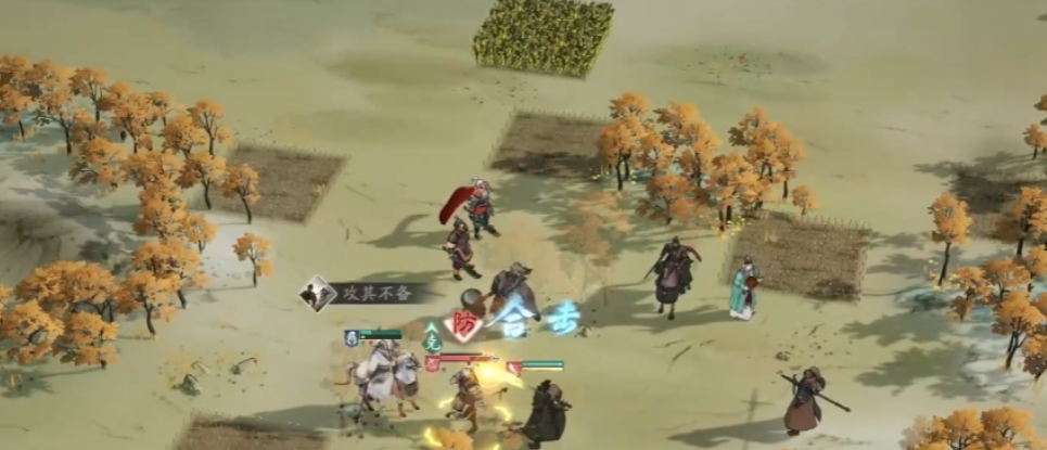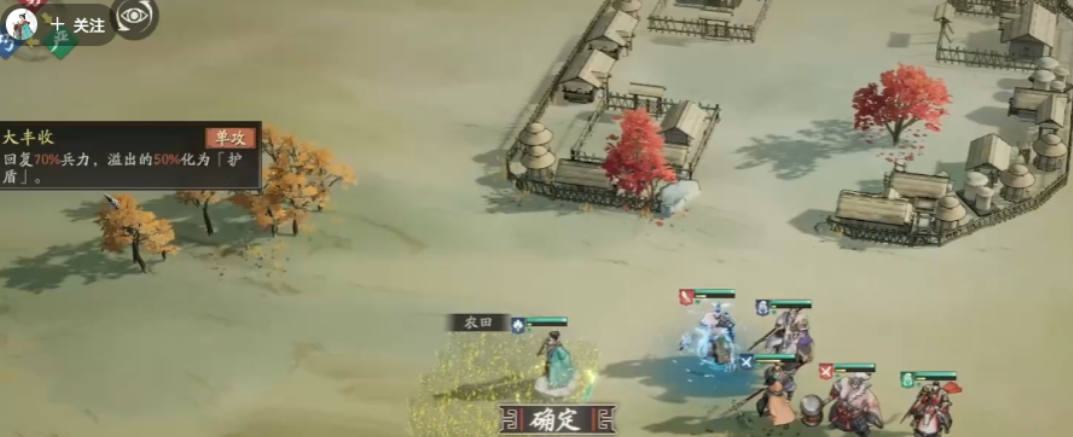 来到战斗中首先要做的就是占领地图上的农田,它能够恢复你70%的兵力或者转化为50%的护盾,这个buff在战斗中是十分重要的,尤其是在你兵力即将耗尽的时候,这个buff能够给你带来十分重要的援助,占领后及时回血,为后期战斗做准备。在战斗的最开始阶段,要注意自己的兵力不要太过于分散,特别是在战斗刚开始敌人正在一步一步的接近你的时候,可以派一些武将去找敌方的小兵打几个小范围的战斗,这样就可以把敌人分散开来,为进攻打开通道。